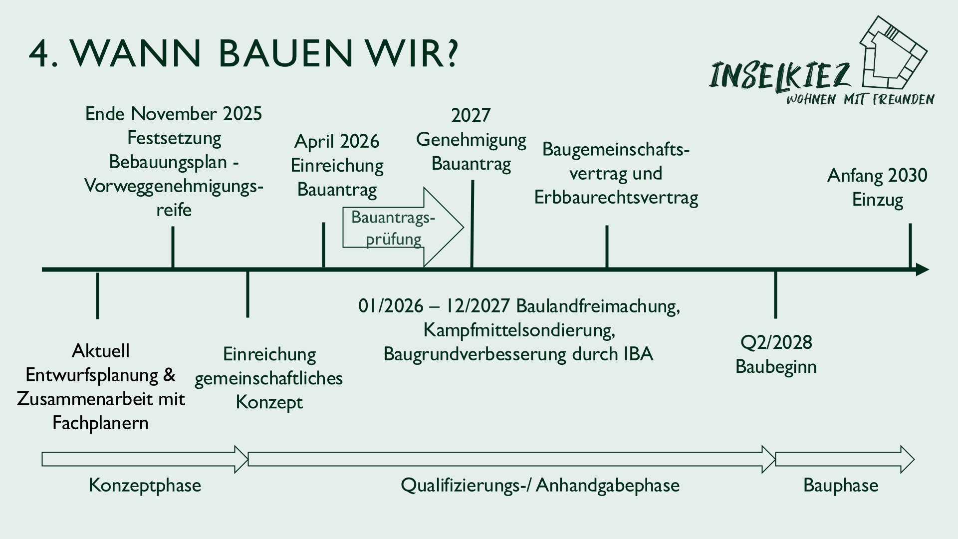 Ab Anfang 2028 geht es dann richtig los: Die Bauphase beginnt und wird etwa zwei Jahre dauern. Unser Ziel ist es, Anfang 2030 gemeinsam unser neues Zuhause im Inselkiez zu beziehen – ein aufregender Moment, auf den wir alle hinarbeiten!